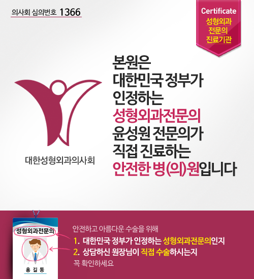 | 제목 | [공지] 본원은 대한민국 보건복지부가 인증한 성형외과 전문의가 직접 진료하는 안전한 병(의)원입니다. |